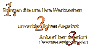 * Bitte beachten Sie: Der Verkäufer muss volljährig und voll geschäftsfähig sein. Alle vorgelegten Stücke werden nach bestem Wissen und Gewissen begutachtet. Auf dieser Grundlage unterbreiten wir dem Verkäufer bei Interesse an einem Ankauf ein entsprechendes Angebot. Grundlage der Bewertung ist der Tageskurs am Tag der Begutachtung in unseren Geschäftsräumen. Für den Ankauf benötigen wir eine vollständig ausgefüllte und unterschriebene Eigentumsbestätigung sowie einen gültigen Ausweis. Dieses Formular wird von uns zur Verfügung gestellt. Bei Zusendung: Zusendungen von Wertsachen geschehen ausschließlich auf Kosten und Risiko des Versenders. Bitte nutzen Sie zu Ihrer Sicherheit einen dem Wert angemessenen versicherten Versandweg. Sollte keine Angebotsabgabe möglich sein oder Ihnen das Angebot nicht zusagen, schicken wir die Gegenstände auf Kosten und Risiko des Verkäufers versichert an die uns genannte Adresse zurück. |